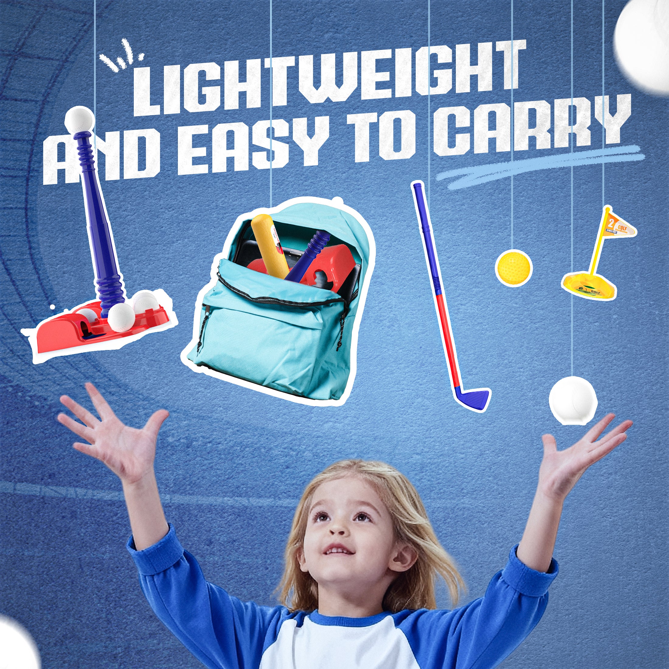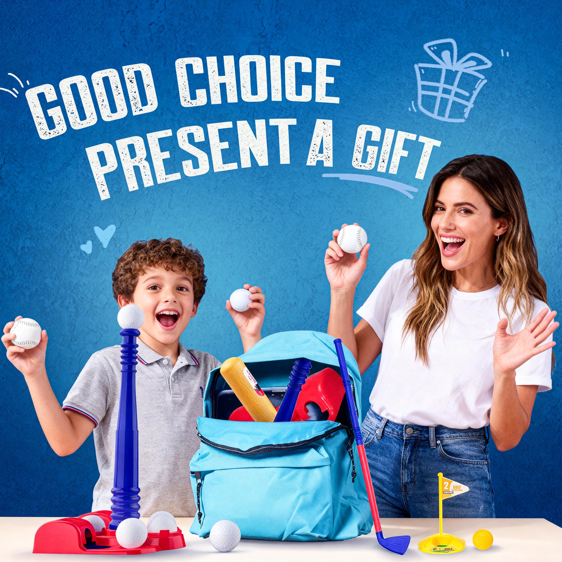 YCFUN 2-in-1 T Ball & Golf Set: This all-in-one set includes a retractable baseball bat, multiple balls, a golf club, bases, and handy storage bags. Perfect for keeping kids active indoors or outdoors. Everything young athletes need to start swinging, hitting, and having fun.
