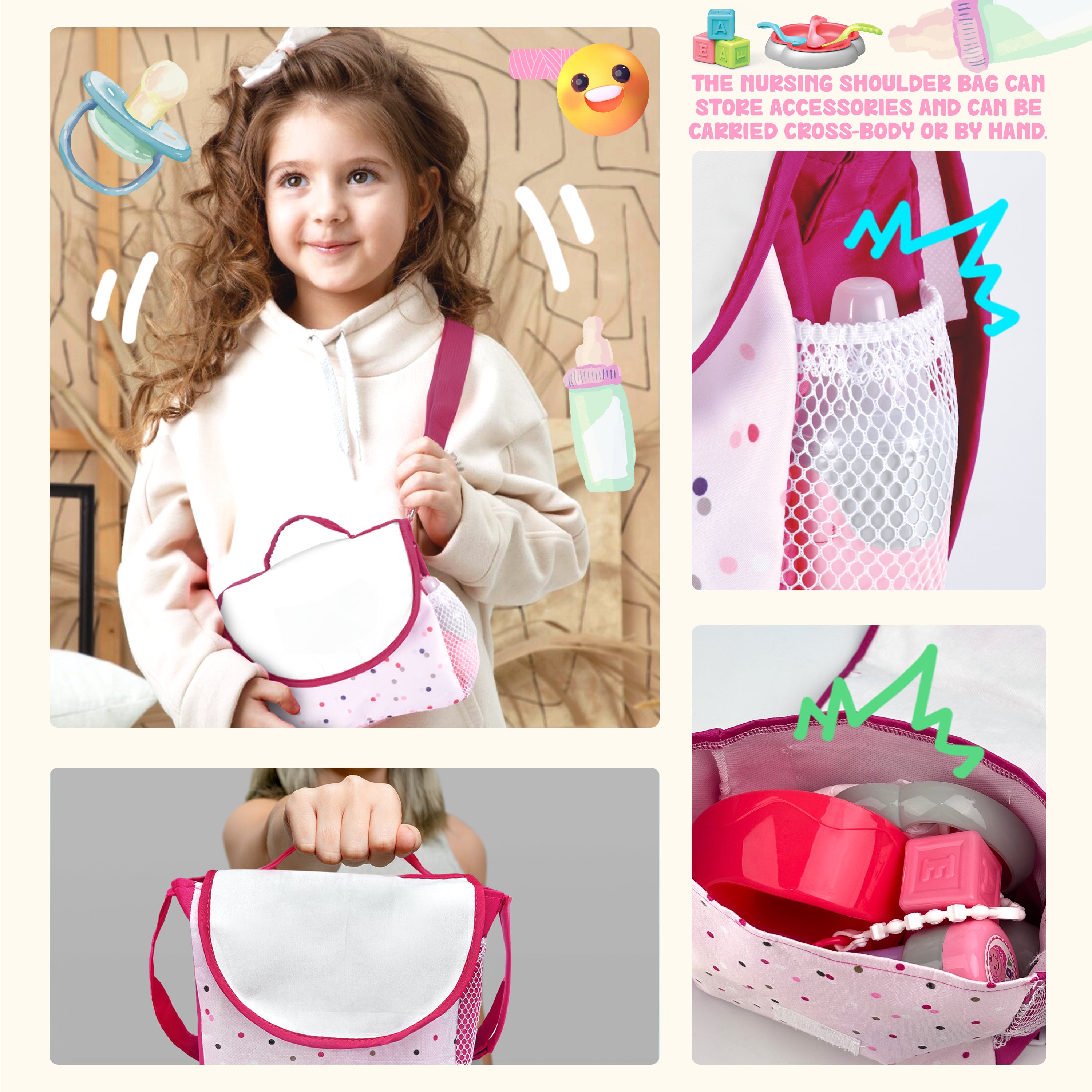 Baby care bag has shoulder straps that are adjustable for easy carrying of accessories. The doll diaper bag can store baby toys and accessories, and you can also put down a mat for the doll to lie down for diaper changes or sleep. There are letter styles on the baby toys, the doll pacifier can be clipped on clothes, and the slippers and diapers are very realistic.
