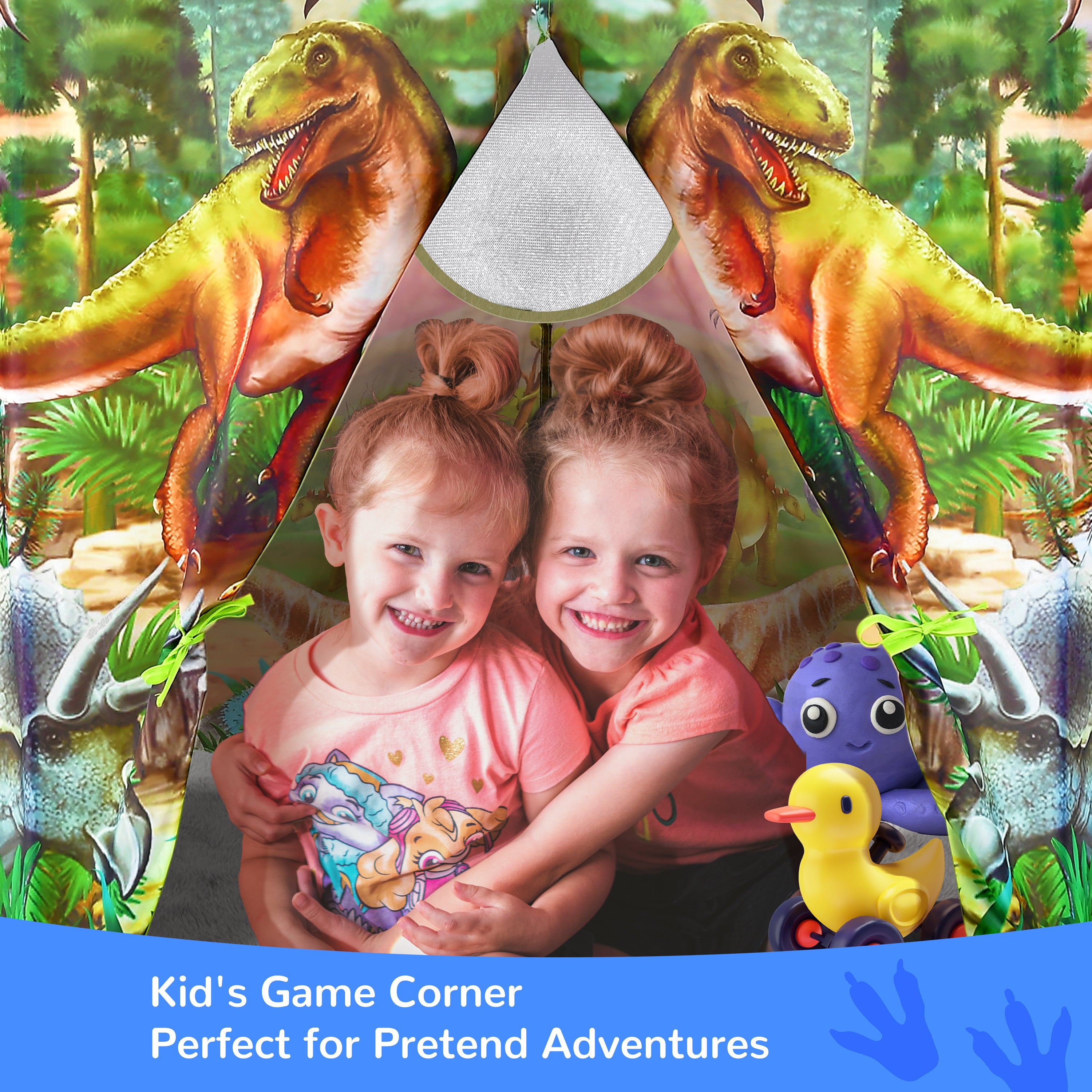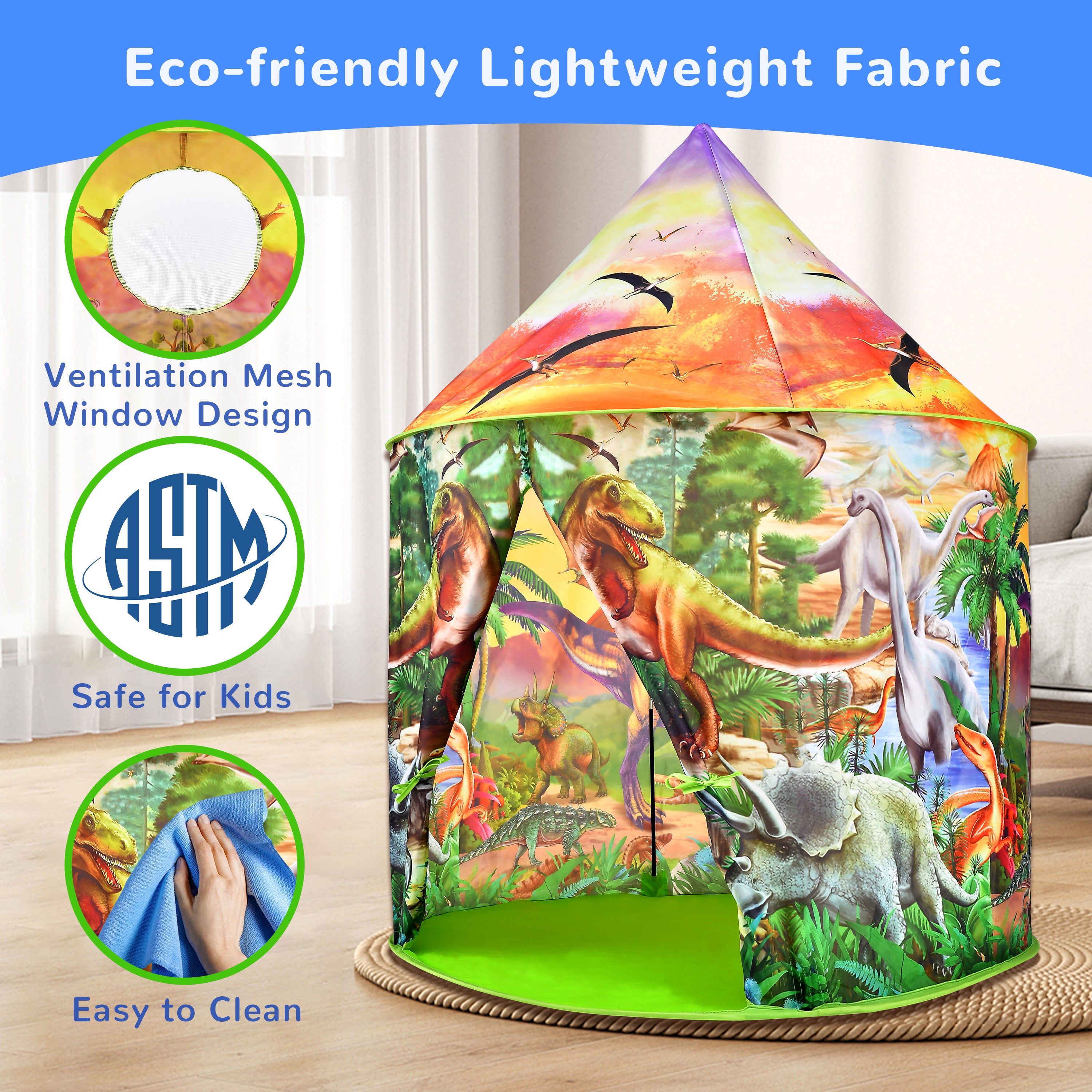【Dinosaur Tent for Kids 3-5】Our tent is made of easy-to-clean polyester. It allows three kids to enjoy their personal space and have fun inside an dinosaur tents for kids indoor.