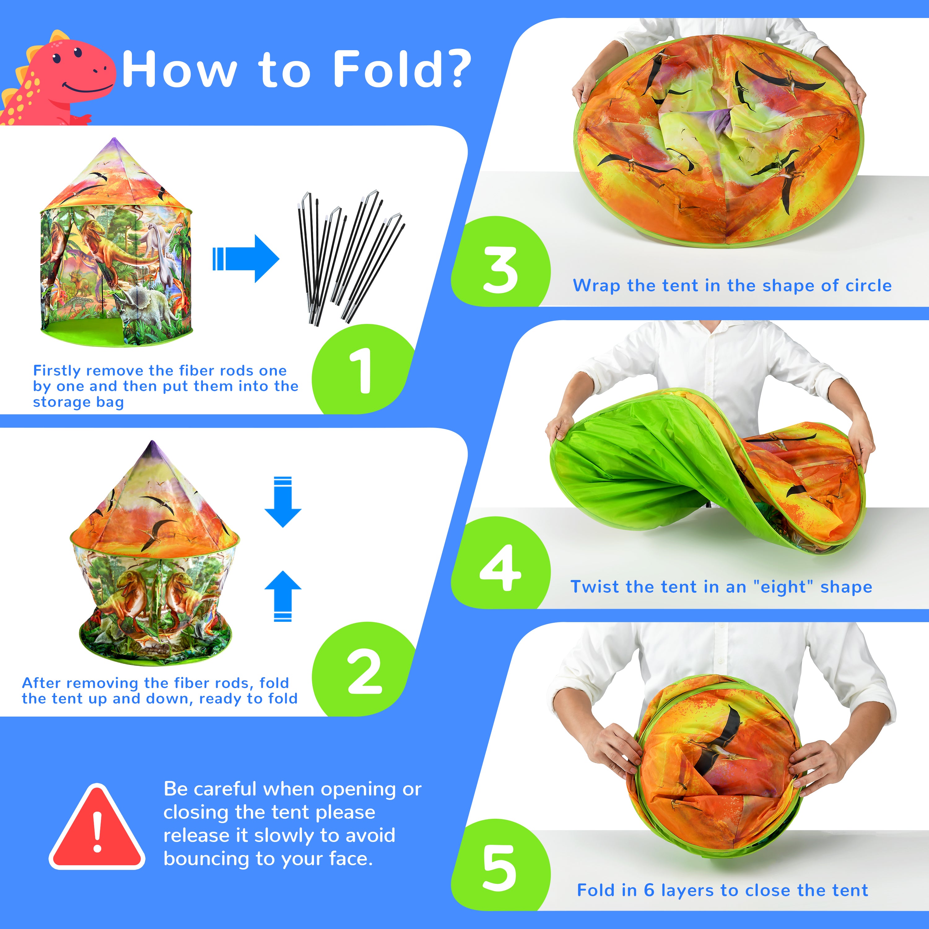 【Explore the Dino World】Only takes a few minutes to install our pop-up dinosaur tent with 4 fiber poles and your kids will immediately enter a prehistoric playground to read dinosaur-related books and learn dinosaur-related knowledge in the kids tent indoor.