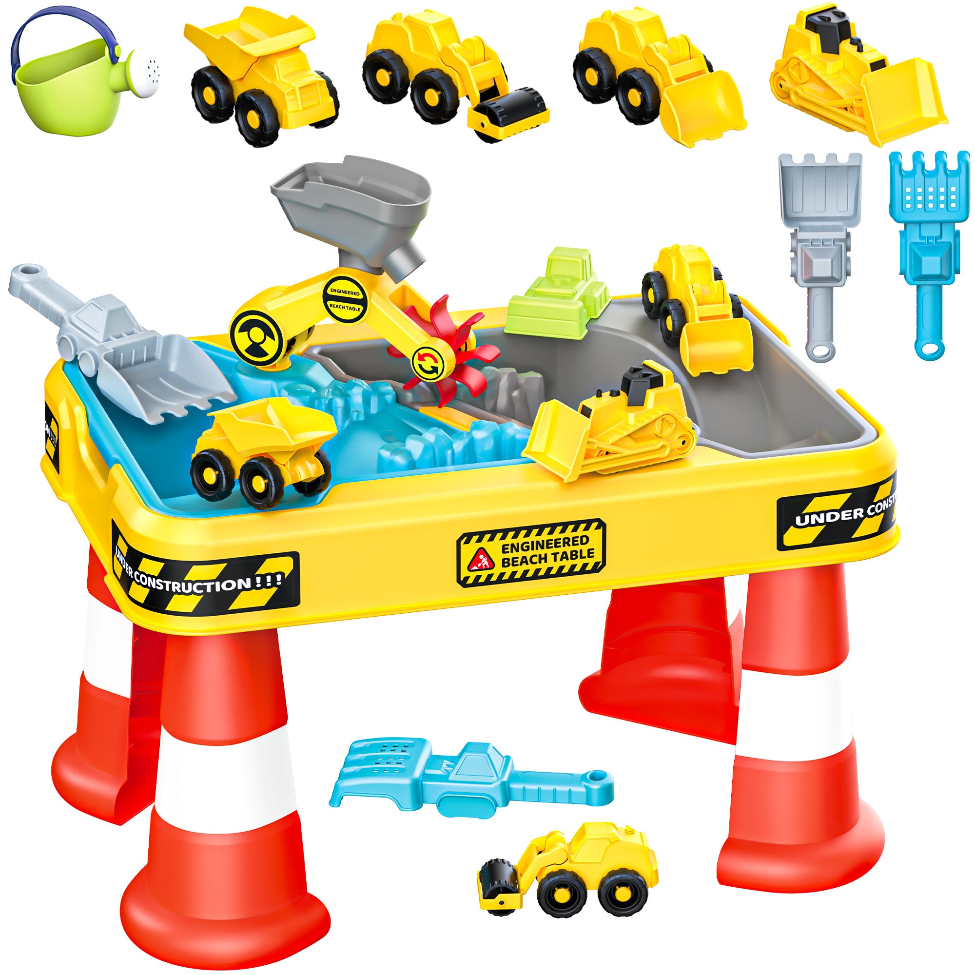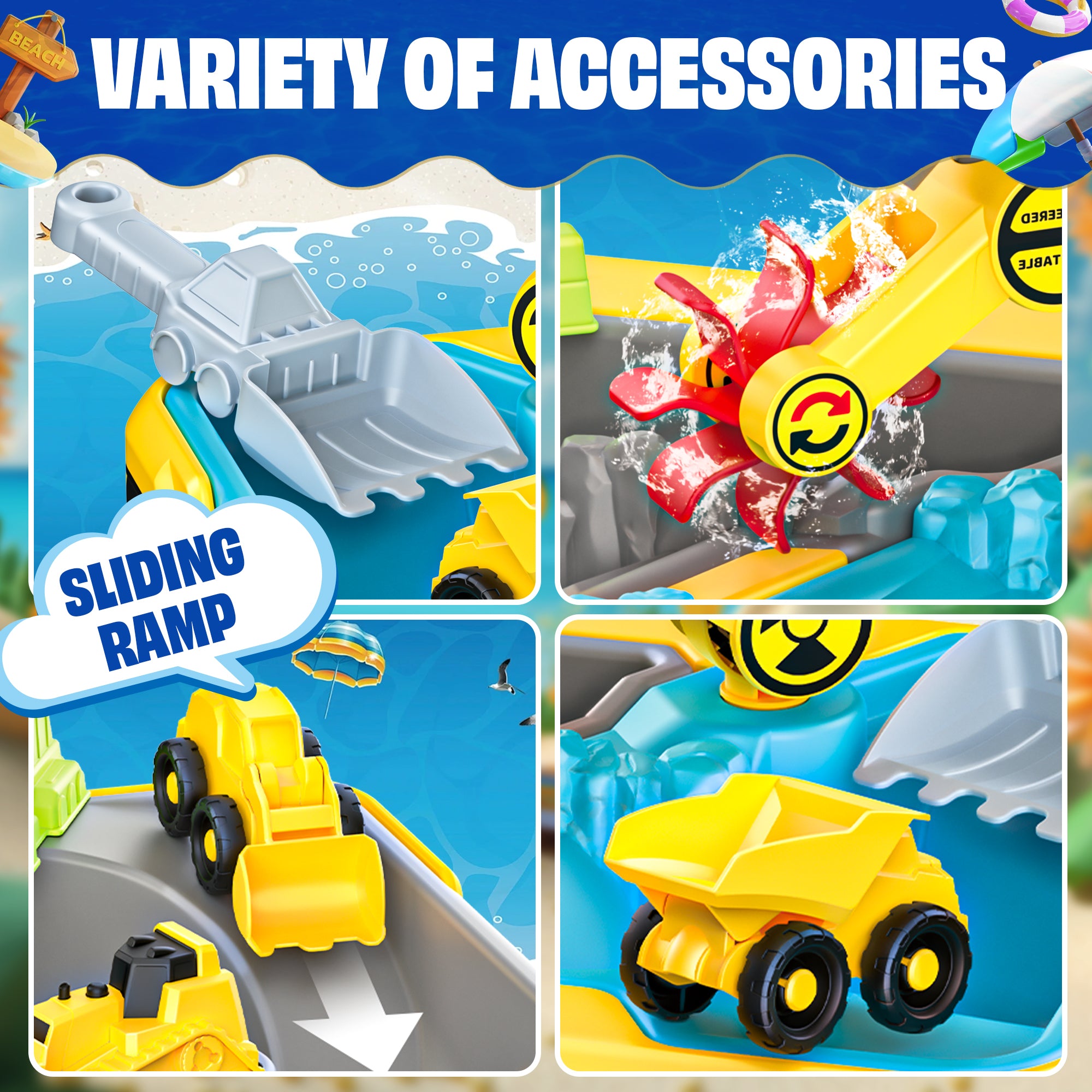 Sand & Water Play In One Table: This 2-in-1 sand and water table offers endless fun for toddlers! Kids can dig, splash, and build with the included digger toys, wheels, and accessories – suitable for sensory play and outdoor adventures