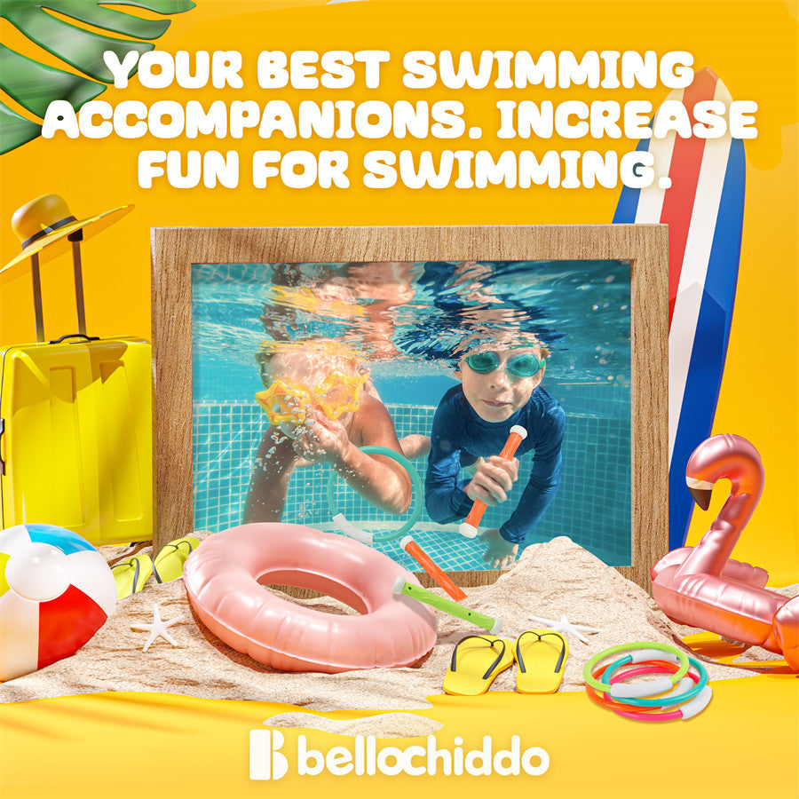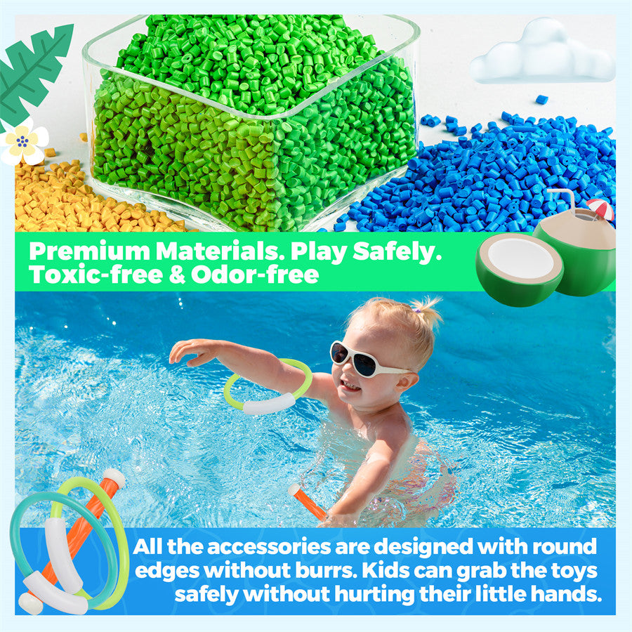 💕𝗦𝗮𝗳𝗲 & 𝗣𝗿𝗲𝗺𝗶𝘂𝗺 𝗠𝗮𝘁𝗲𝗿𝗶𝗮𝗹𝘀: Made of premium ABS materials, the pool toys for kids ages 4-8 are toxic-free and odor-free. All the swim toys are designed with round corners and comply with American toy standards and ASTM safety testing certification, which is safe for kids to play with.
