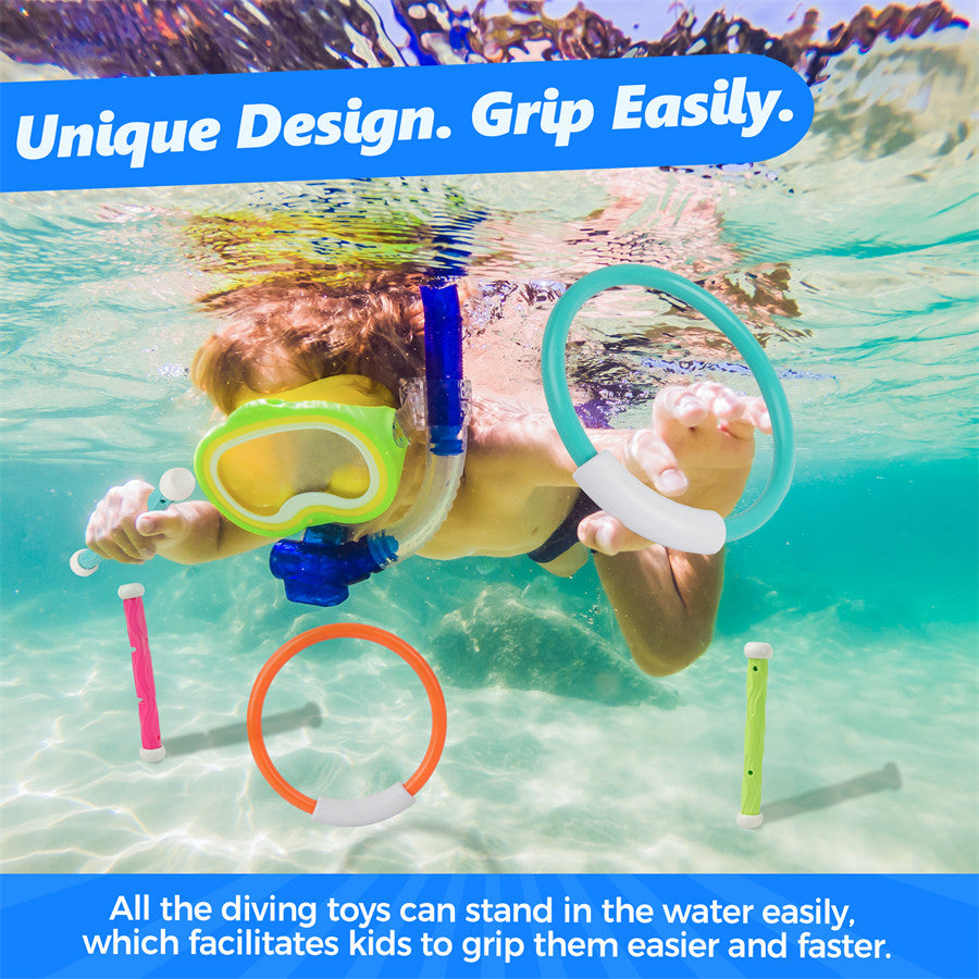 🤿𝗧𝗿𝗲𝗮𝘀𝘂𝗿𝗲 𝗛𝘂𝗻𝘁𝗶𝗻𝗴 𝗚𝗮𝗺𝗲 𝗨𝗻𝗱𝗲𝗿𝘄𝗮𝘁𝗲𝗿: Throw the diving toys into the swimming pool, and then start the exciting treasure-hunting pool games at once. These swim toys for kids ages 4-8 help to exercise kids' diving and swimming skills as well as enjoy summer water fun with your families!
