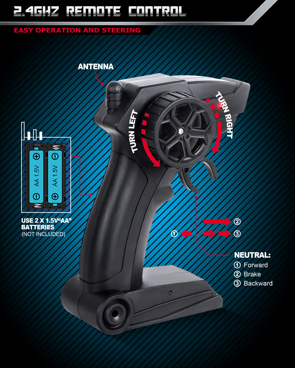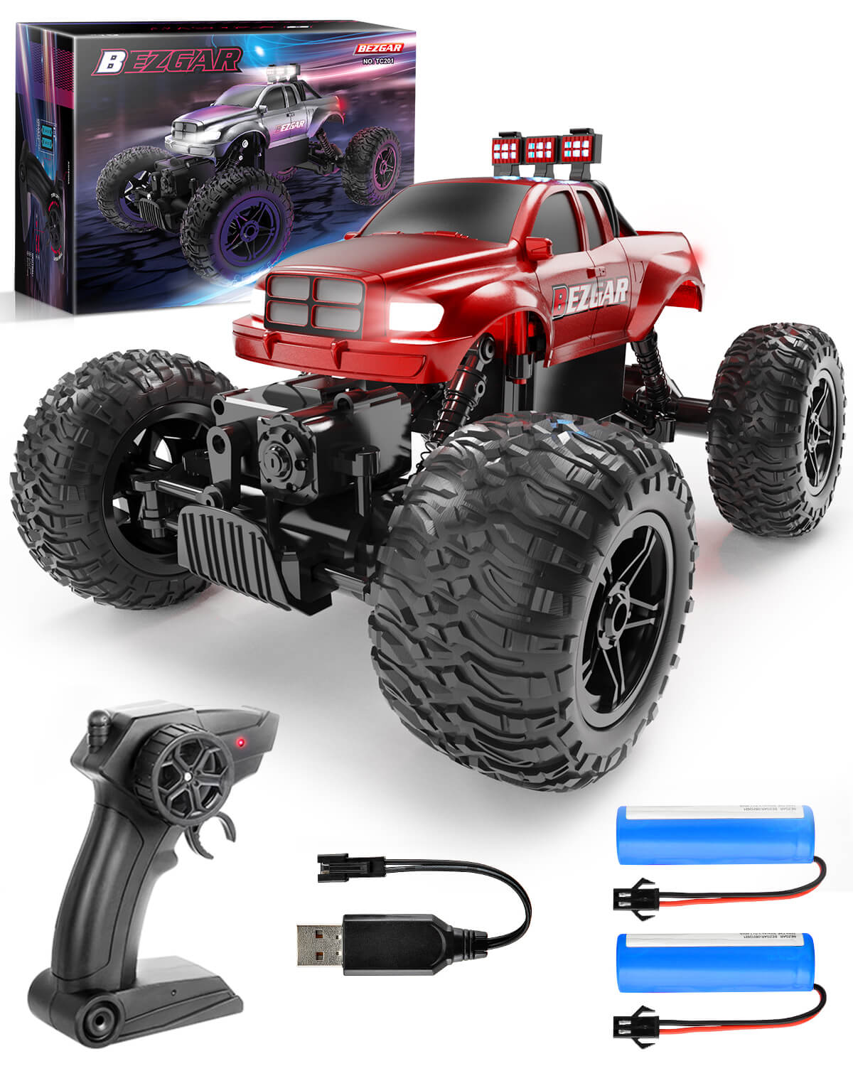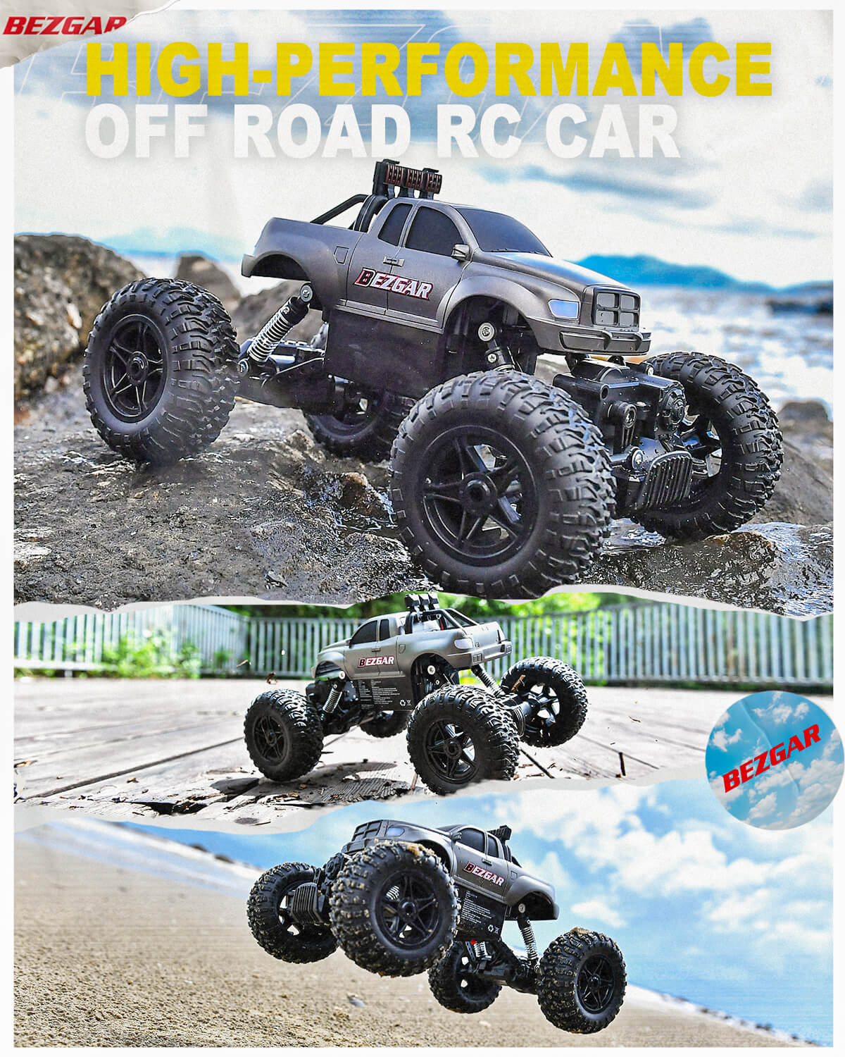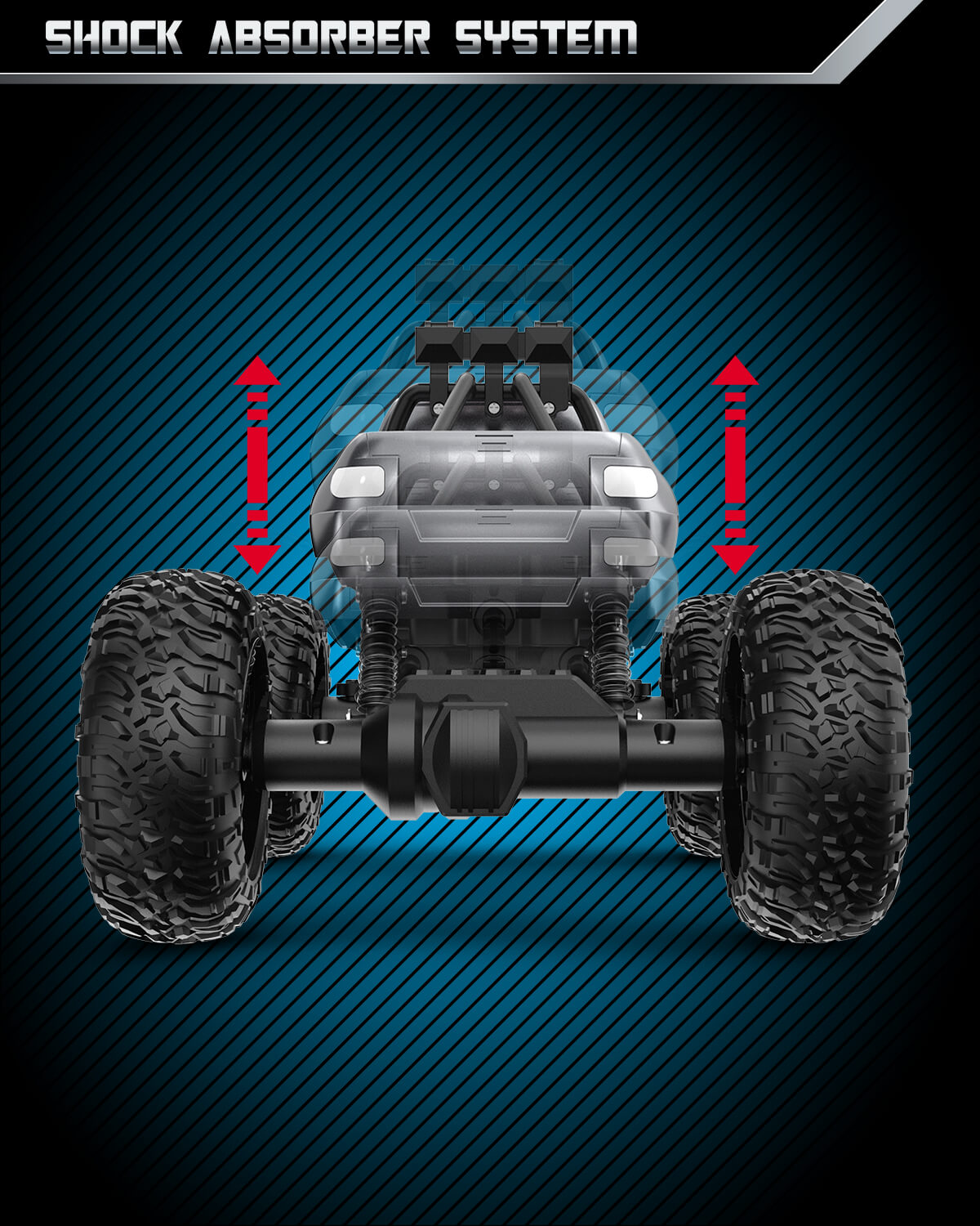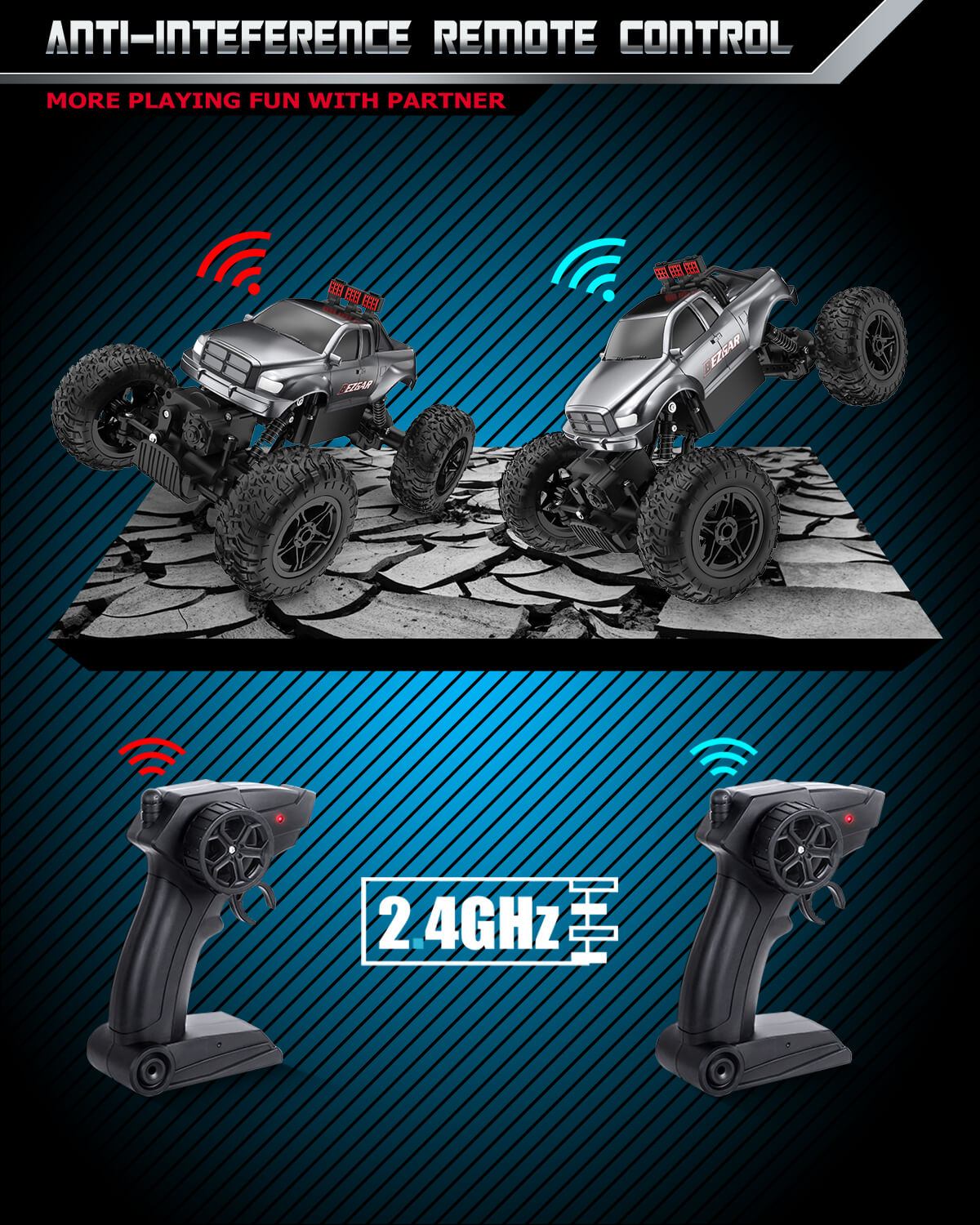 The easy-to-use 2.4GHz frequency non-interference remote controller makes the car ready to run with anti-interference functions. It can prevent signal interference when multiple vehicles playing at the same time. The radio control distance is about 50 meters, it is a great off-road monster truck for indoor and outdoor.