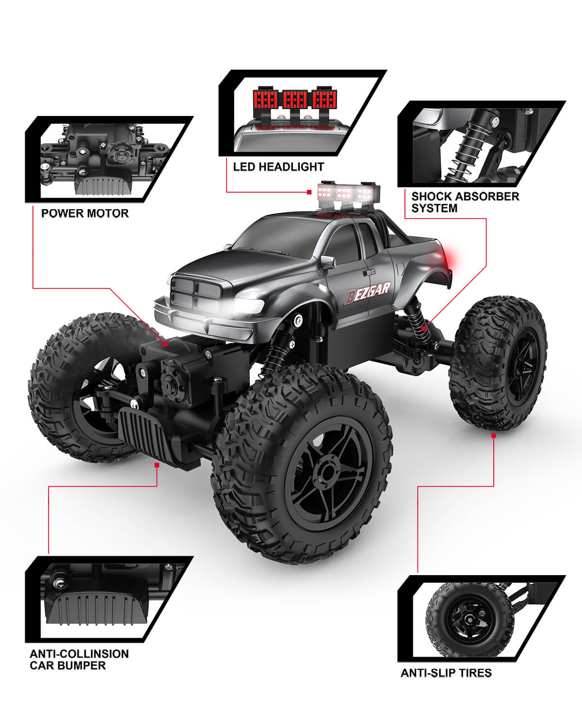 The whole chassis of the remote control car is made of ABS plastic and dual motor power can climb 45¡ãslope that excellent to climb over objects indoor/outdoor. All these properties give the truck a better collision resistance to prolong its life span.