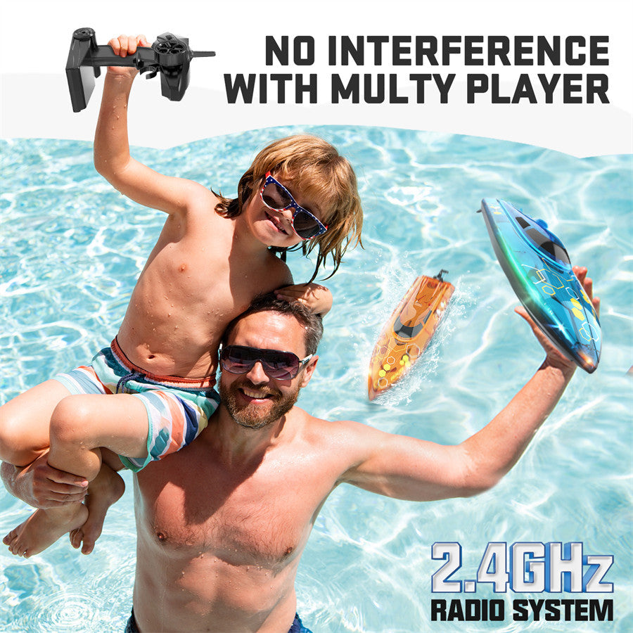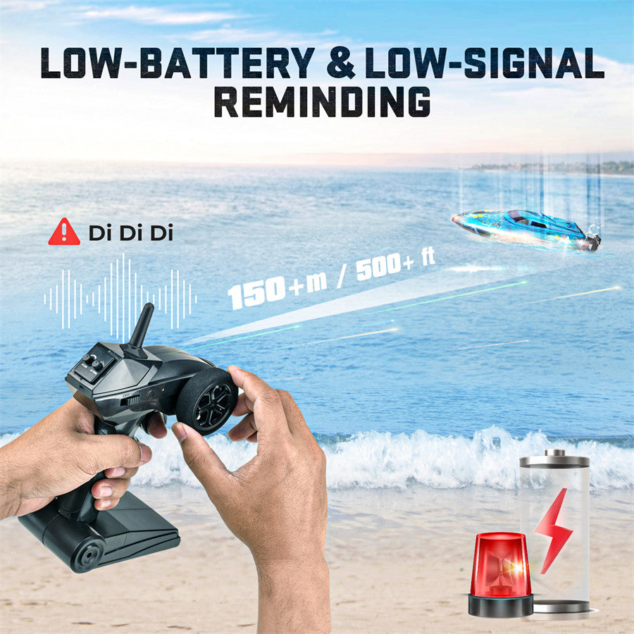𝐋𝐎𝐖-𝐁𝐀𝐓𝐓𝐄𝐑𝐘 & 𝐋𝐎𝐖-𝐒𝐈𝐆𝐍𝐀𝐋 𝐑𝐄𝐌𝐈𝐍𝐃𝐈𝐍𝐆: The smart 2.4Ghz long distance remote control and featured with non-interference, multiple RC boats can race at the same time within the range of 500ft. Don't worry about the boat fails to return back, the transmitter will make the alarming sounds to remind you of calling back the boat when the battery or signal is weak.